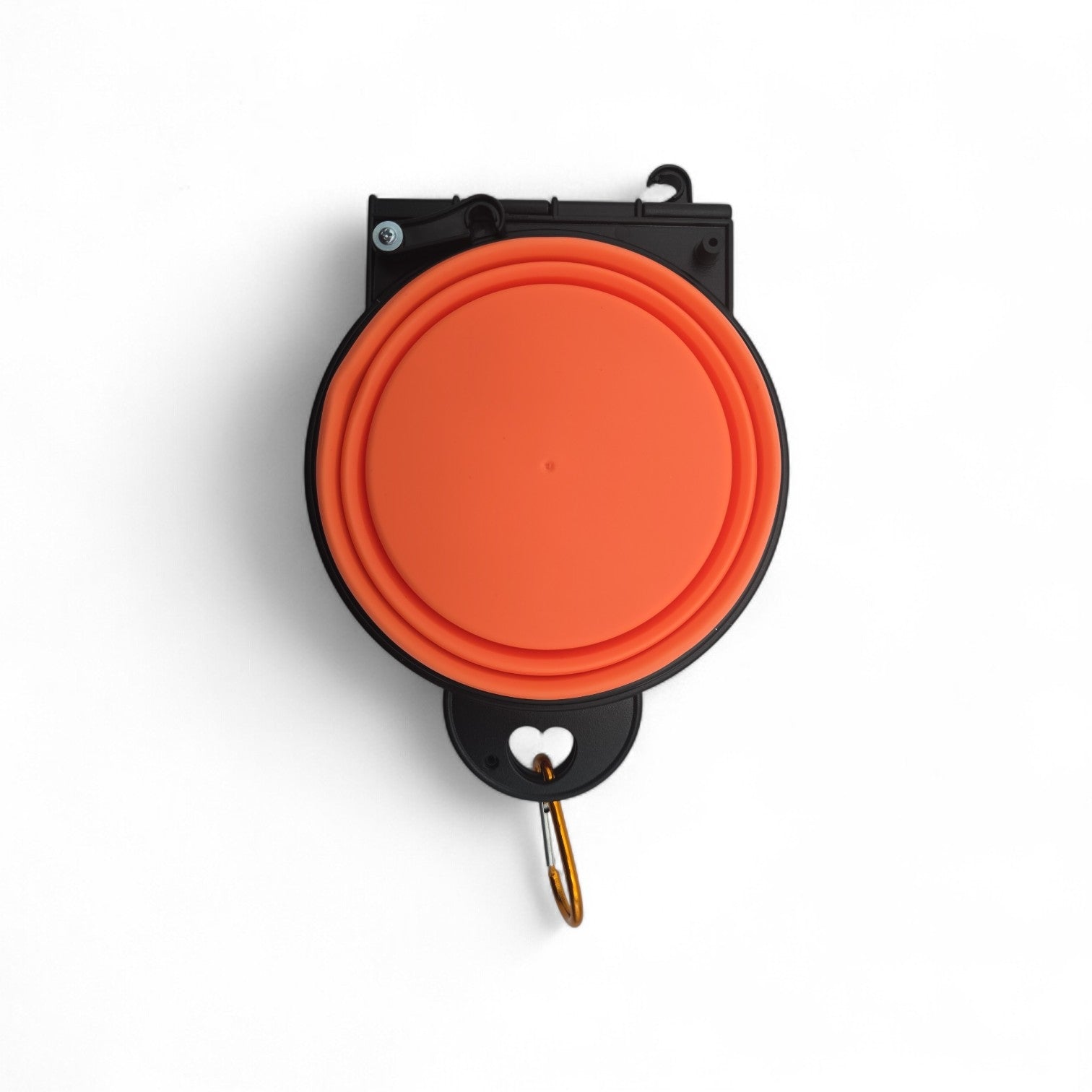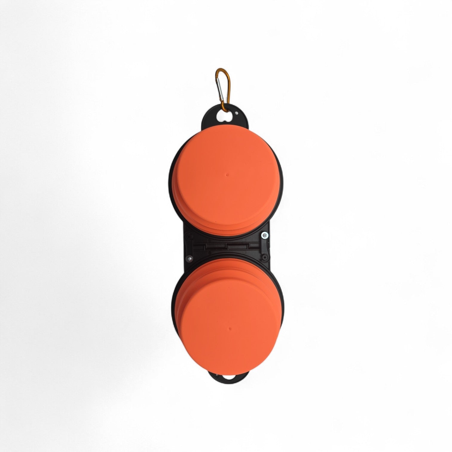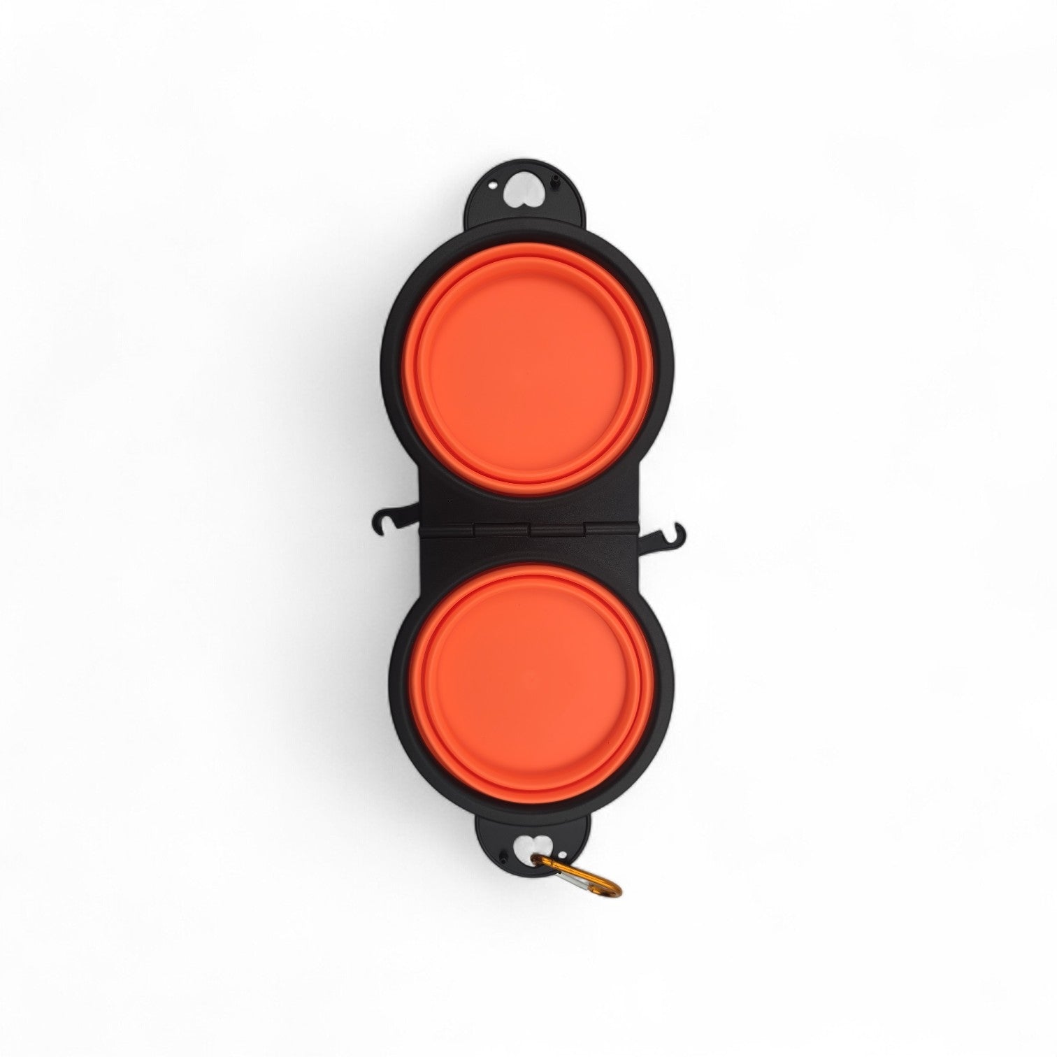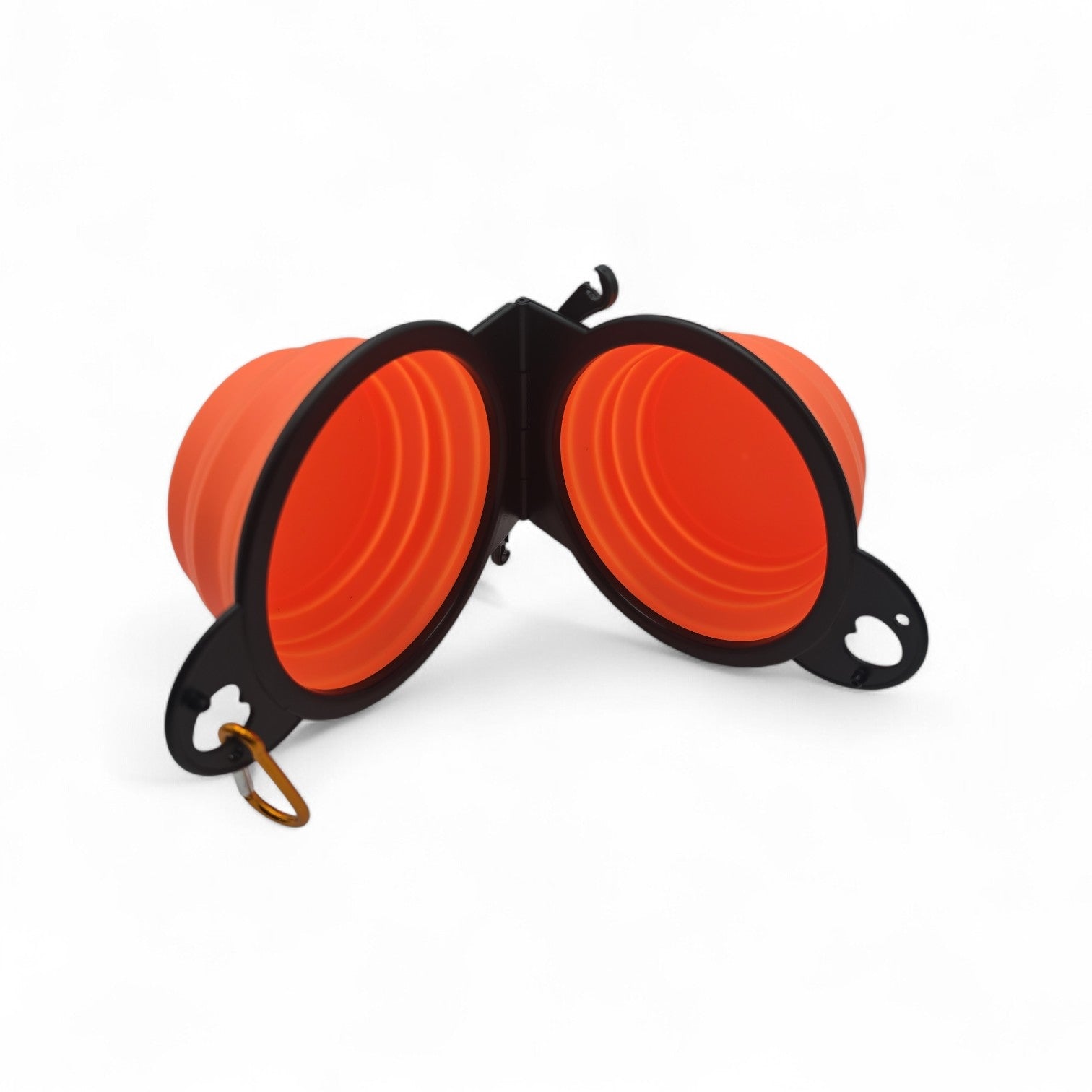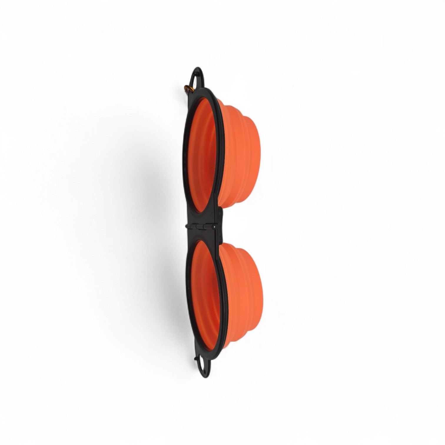 Allg. Infos: Doppelnapf aus Silikon, faltbar, mit Befestigungshaken, Farbe Orange, Masse (von einem Napf): 9 cm Durchmesser (Innendurchmesser an Basis), 13 cm Durchmesser (Innendurchmesser oberer Rand) 5.5 cm Höhe, Gewicht 125g